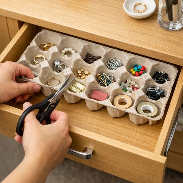 Vystrihnutím kartónu od vajec tak, aby sa zmestil do zásuvky, môžete vytvoriť efektívny organizér na drobnosti, ako sú šperky, kancelárske potreby alebo kozmetika. Zmerajte rozmery zásuvky a kartón upravte tak, aby sa zmestil. Jednotlivé priehradky udržiavajú predmety úhľadne oddelené a ľahko sa dajú nájsť. Je to skvelý spôsob, ako opätovne využiť kartóny a zároveň udržať zásuvky v poriadku.