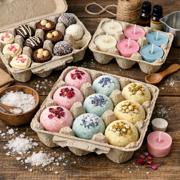 Kartóny od vajec môžu slúžiť ako formičky na výrobu domácich maškŕt, sviečok alebo bômb do kúpeľa. Kalíšky sú ideálne na tvarovanie malých cukríkov, ako sú čokolády, alebo na liatie vosku na výrobu sviečok. Na bomby do kúpeľa zmiešajte ingrediencie, pevne ich vtlačte do kalíškov a nechajte ich zaschnúť. Po stuhnutí ich jednoducho vyberte a vychutnajte si svoje domáce výtvory.