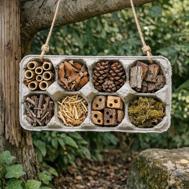 Premeňte kartóny od vajec na ekologické kŕmidlá pre vtáky tak, že každý pohár naplníte vtáčím krmivom a kartón zavesíte v záhrade. Prípadne si vytvorte hotel pre hmyz tak, že poháre naplníte prírodnými materiálmi, ako sú vetvičky, listy a slama, a potom ich umiestnite do tieňa. Oba projekty podporujú miestnu divokú zver a prinášajú nádych prírody do vašej záhrady.