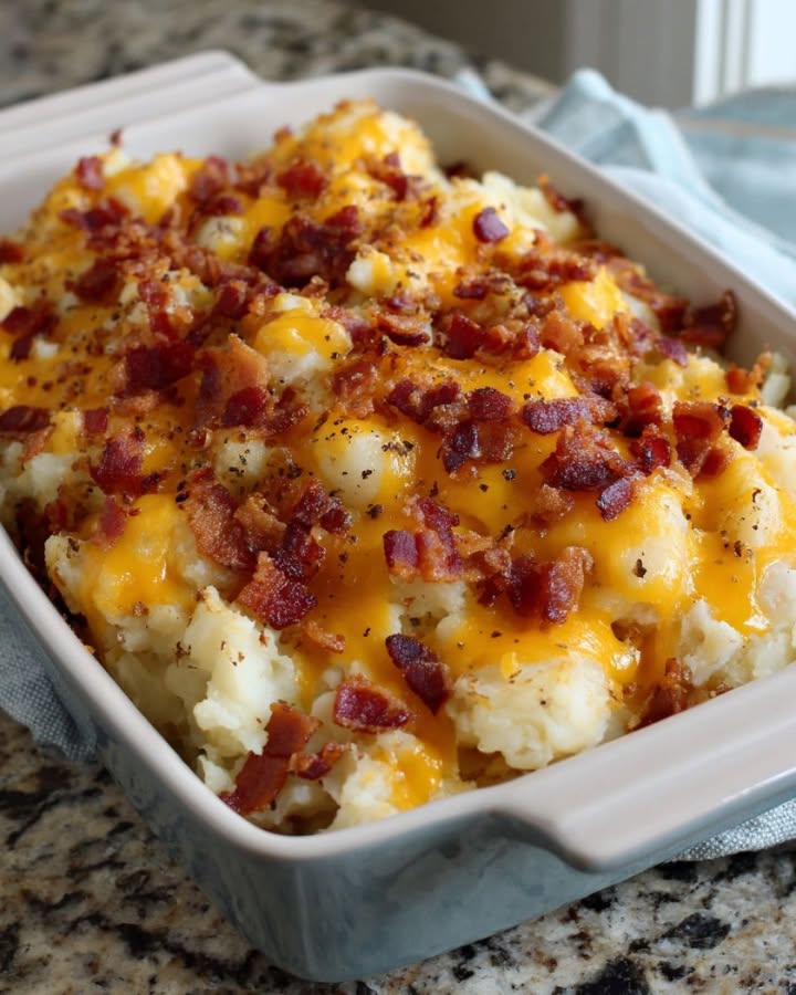 Pečené zemiaky s prílohami sú klasickým príkladom amerického komfortného jedla – jednoduché ingrediencie premenené na niečo hlboko uspokojujúce. Tento 5-ingredienčný kastról využíva rovnakú myšlienku a zjednodušuje ju do pokrmu, ktorý môžete počas pracovného týždňa zasunúť do rúry alebo bez problémov priniesť na spoločné jedlo. Koncept plnenia zemiakov syrom, slaninou a kyslou smotanou má korene v kultúre steakových reštaurácií z polovice 20. storočia, kde pečený zemiak slúžil ako prázdne plátno pre bohatosť chuti. Tu si tento chuťový profil požičiavame a vkladáme ho do útulného formátu kastróla. S len hŕstkou ingrediencií a bez zložitých techník je ideálny pre začínajúcich kuchárov, no stále prispôsobiteľný a dostatočne zaujímavý pre tých z nás, ktorí sa radi hrajú v kuchyni.